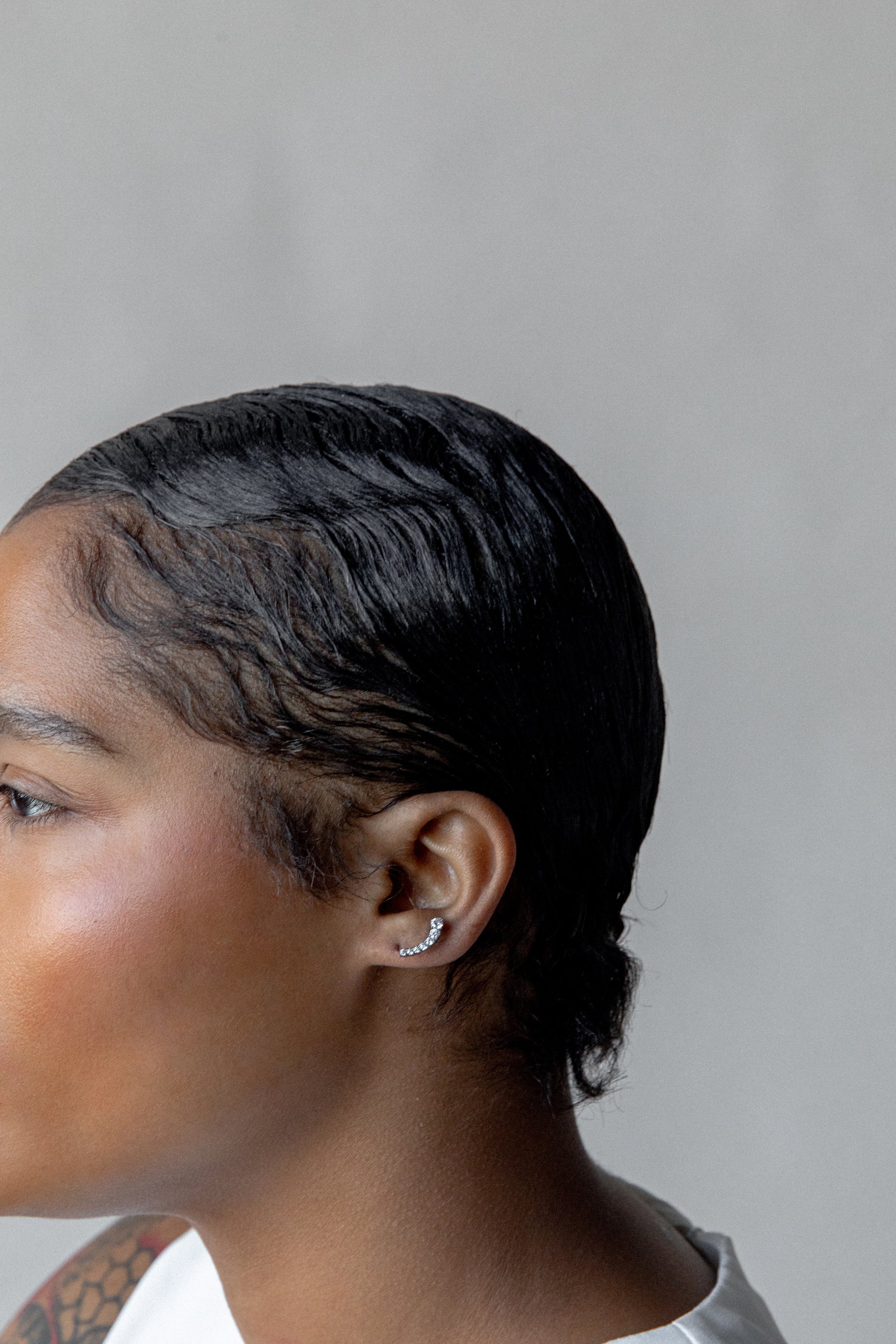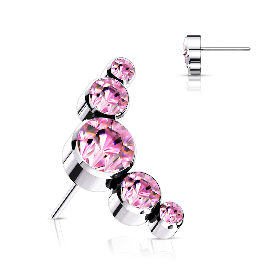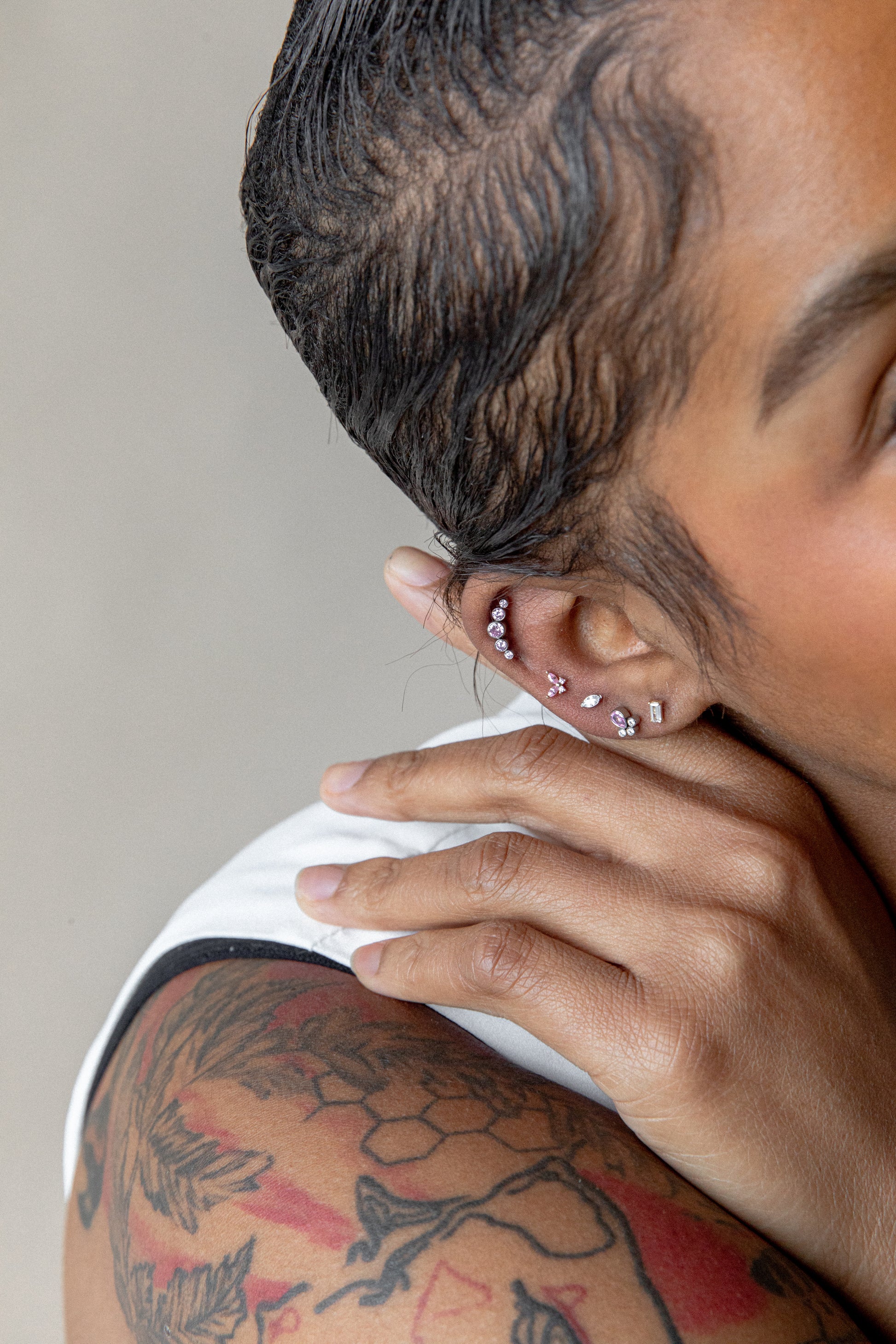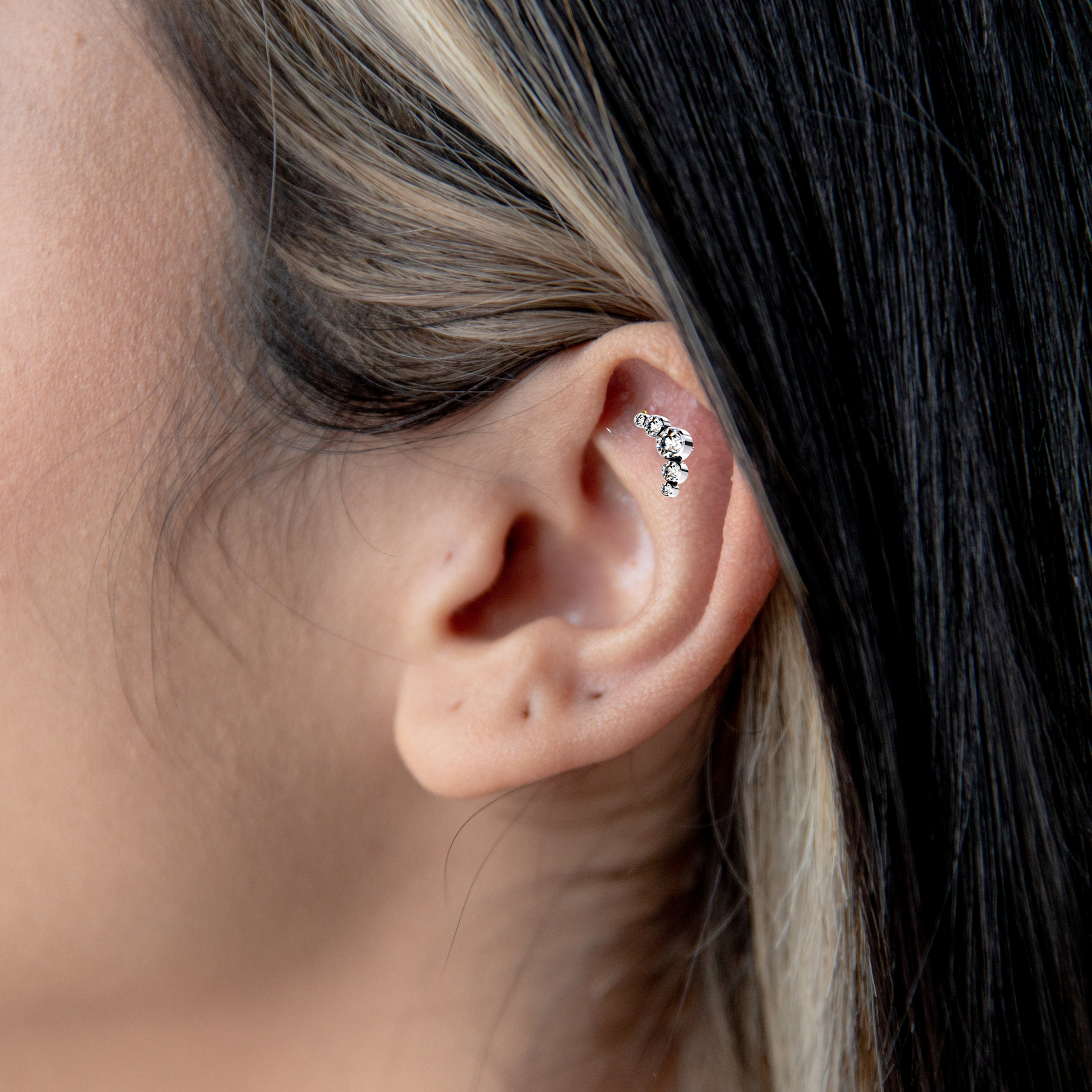 MATERIAL: Titanium; Implant-grade, hypoallergenic. Suitable for those who have skin sensitivities or whose skin is easily reactive to certain metals or nickel. STONES: CZ NUMBER OF STONES: 5 BALL SIZE: 12mm EAR PIERCING CLOSURE SYSTEM: Flatback threadless backing, long post (8mm)