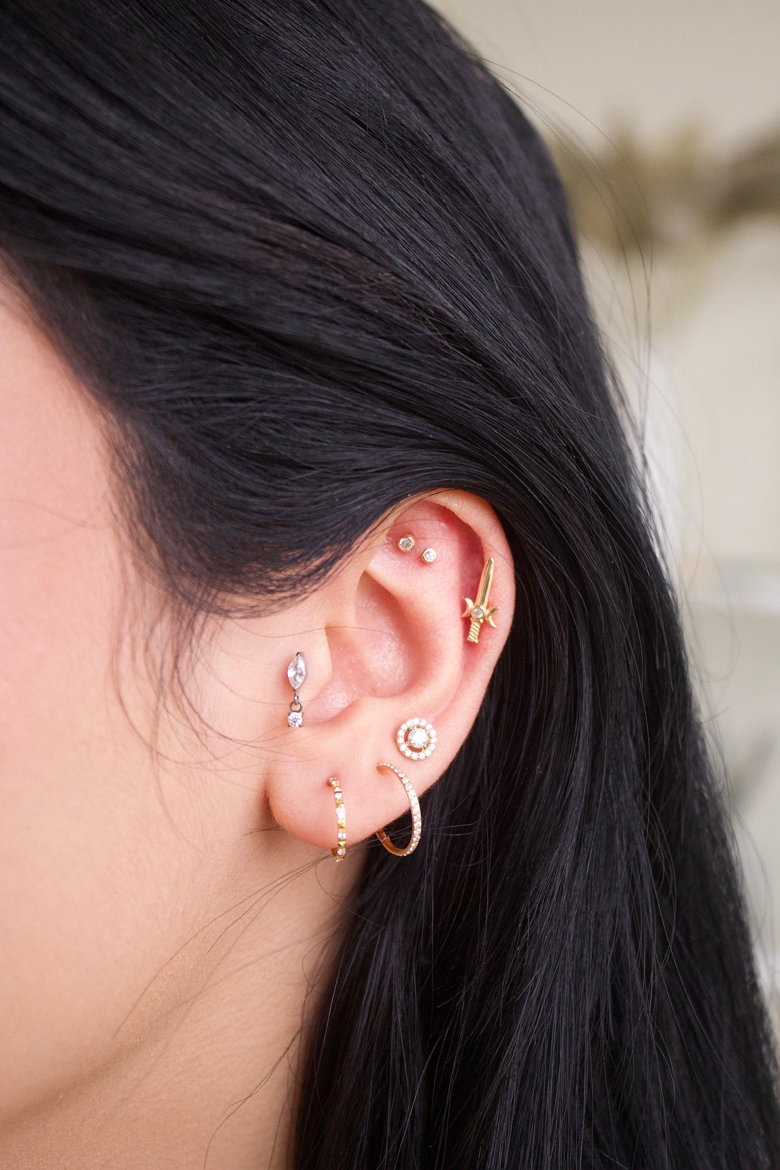 MATERIAL: 14K Solid Gold. BALL SIZE: 5mm STONE: CZ NUMBER OF STONES: 4 EAR PIERCING CLOSURE SYSTEM: Flatback threadless backing, long post (8mm)