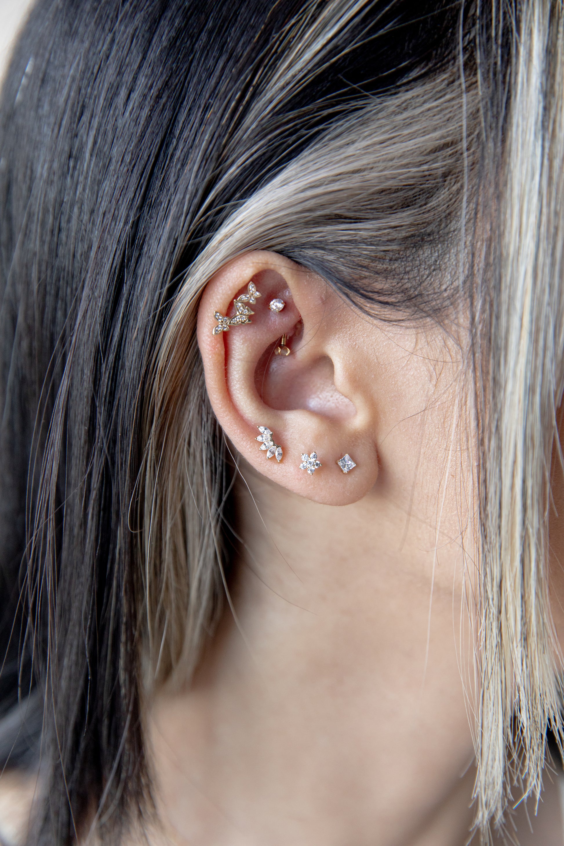MATERIAL: 14K Solid Gold. BALL SIZE: 5mm DIAMOND: CZ NUMBER OF DIAMONDS: 6 EAR PIERCING CLOSURE SYSTEM: Flatback threadless backing, long post (8mm)
