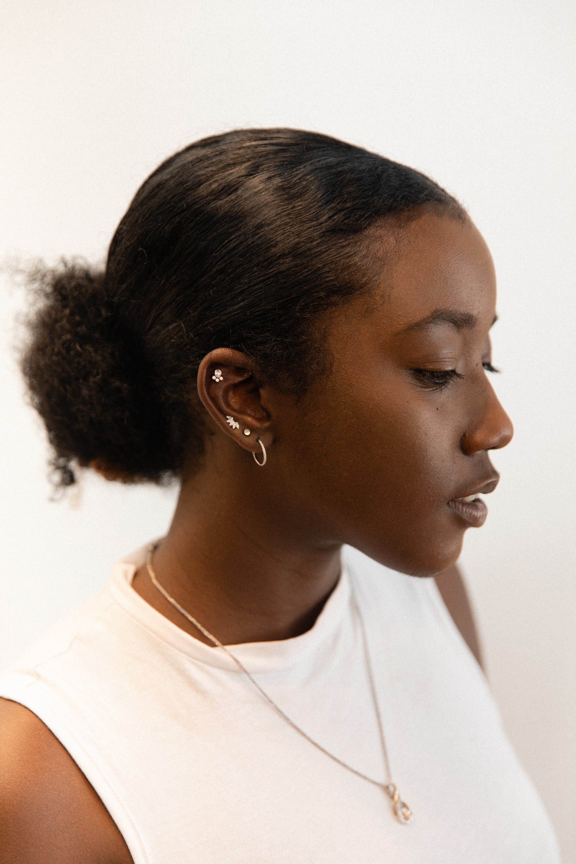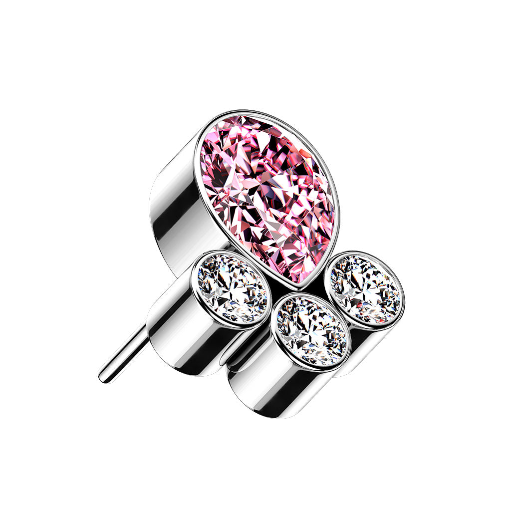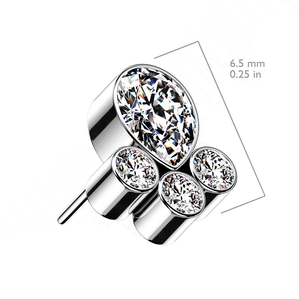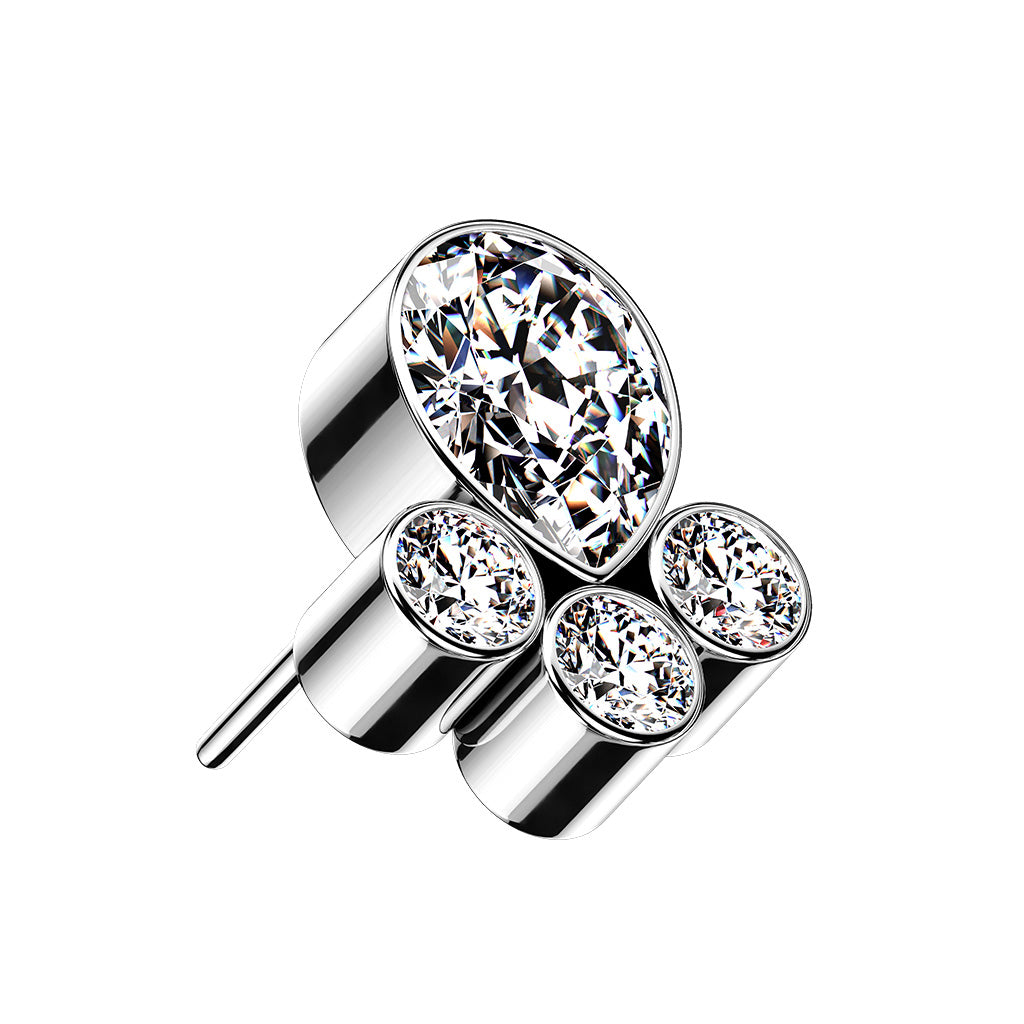 MATERIAL: Titanium; Implant-grade, hypoallergenic. Suitable for those who have skin sensitivities or whose skin is easily reactive to certain metals or nickel. STONE: CZ NUMBER OF STONES: 4 BALL SIZE: 6mm EAR PIERCING CLOSURE SYSTEM: Flatback threadless backing, long post (8mm) shorter post (6mm)