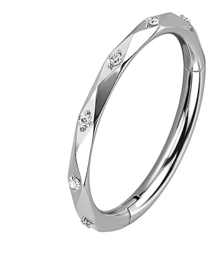 MATERIAL: Titanium; Implant-grade, hypoallergenic. Suitable for those who have skin sensitivities or whose skin is easily reactive to certain metals or nickel. STONE: CZ HOOP SIZE: 8mm HOOP THICKNESS: 16G EAR PIERCING CLOSURE SYSTEM: Seamless hoop
